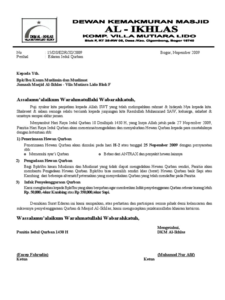 Contoh Surat Permohonan Qurban 2019 Kumpulan Contoh. Kepada Yth BapakIbuSdriPara Dermawan. Demikian surat permohonan bantuan hewan qurban ini kami sampaikan sebagai acuan demi suksesnya kegiatan penyembelihan hewan qurban perdana di masjid al muttaqin perum.