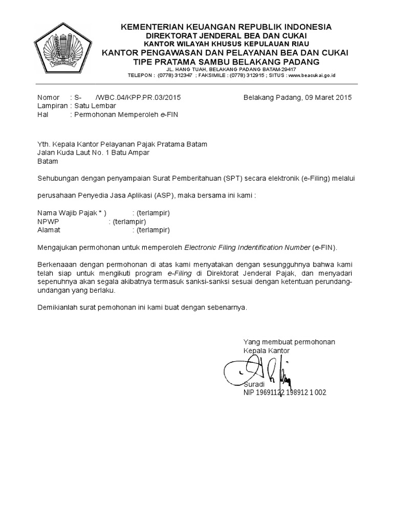 Surat permohonan efin doc. Permohonan ini dilakukan wajib pajak dengan menggunakan formulir permohonan efin berikut. Gedung Pemuda Lantai 2 JlPemuda Raya No66 Rawamangun Jakarta - Indonesia 13220 Phone. Tidak harus KPP yang sesuai dengan alamat KTP.