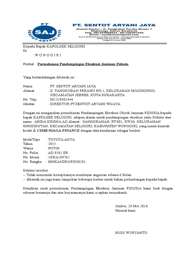 Surat Permohonan Eksekusi Jaminan Fidusia