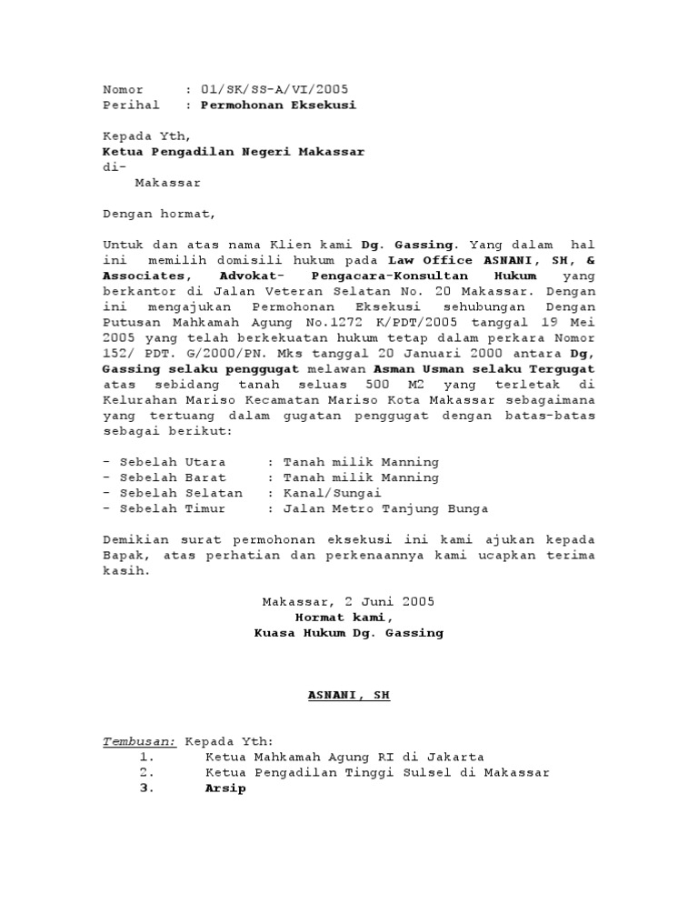 Surat permohonan eksekusi putusan doc. Perlawanan ini pada azasnya tidak menangguhkan eksekusi Pasal 207 ayat 3 HIR dan 227 RBg kecuali apabila segera nampak bahwa perlawanan tersebut benar dan beralasan maka eksekusi ditangguhkan setidak-tidaknya sampai dijatuhkan putusan oleh Pengadilan Agama. Bahwa sampai surat permohonan ini diajukan tergugat syamsudin tidak bersedia mematuhi putusan no. Unduh sebagai doc pdf txt atau baca online dari scribd.