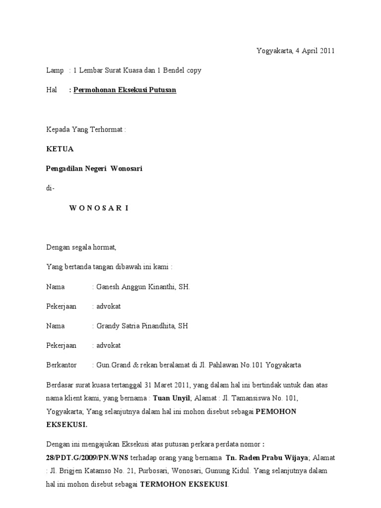 Report Surat Permohonan Permintaan Salinan Putusan rusdydocx Please fill this form we will try to respond as soon as possible. Proses eksekusi atau lelang eksekusi secara hukum telah selesai. Surat permohonan eksekusi ini diajukan kepada ketua pengadilan negeri sesuai dengan pilihan hukum yang tertera dalam akta hak tanggungan dengan dilampiri dokumen dokumen hukum yang diperlukan.