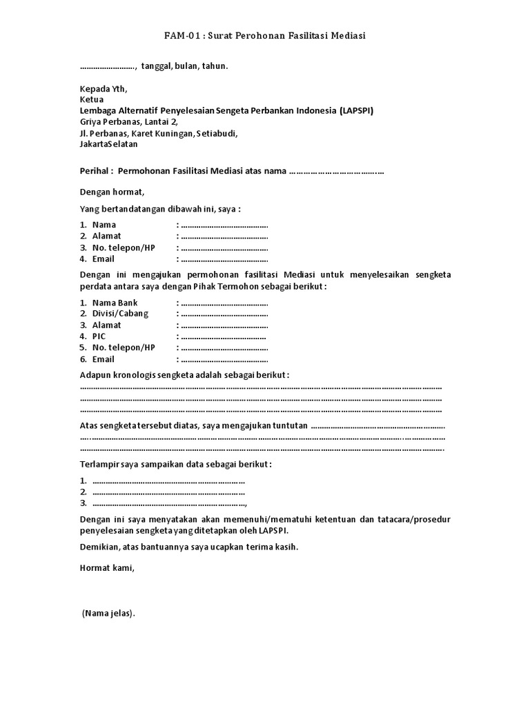Surat permohonan fasilitasi mediasi. Contoh surat permohonan mediasi ke Dinas Tenaga Kerja. Surat Pengajuan Permohonan Fasilitasi Rancangan Peraturan Daerah Fasilitasi Raperda dan Peraturan DPRD Hardcopy hasil pembahasan akhir dengan Pansus DPRD KabupatenKota Raperda KabKota yang diparaf di setiap lembar oleh Bagian Hukum KabupatenKota dan Ketua Pansus Fasilitasi Raperda dan Peraturan DPRD. 3 Ketidakhadiran Para Pihak secara langsung dalam proses Mediasi hanya dapat dilakukan berdasarkan alasan sah.