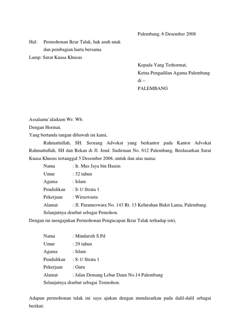 Tuntutan mengabulkan permohonan perceraian hak asuh anak dan pembagian harta gono gini Berikut merupakan contoh surat gugatan cerai dengan menggunakan format pengadilan agama Wilayah Sleman. Ramalan Zodiak Hari ini Rabu 3 Februari 2021 Taurus Labil Virgo Jangan Beri Harapan. Untuk lebih jelasnya berikut contoh surat permohonan adopsi anak atau surat permohonan pengangkatan anak di pengadilan negeri.