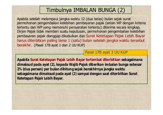 Artikel ini akan mengupas satu bagian dari UU itu yang barangkali tak sering dibahas namun penting untuk dipahami. Selain itu Pasal 27B ayat 3 UU KUP menyatakan wajib pajak juga dapat diberikan imbalan bunga jika permohonan pembetulan permohonan pengurangan atau pembatalan SKP atau permohonan pengurangan atau pembatalan surat tagihan pajak STP dikabulkan sebagian atau seluruhnya sehingga menyebabkan kelebihan pembayaran pajak. Sesuai pasal 43 diatur sbb.