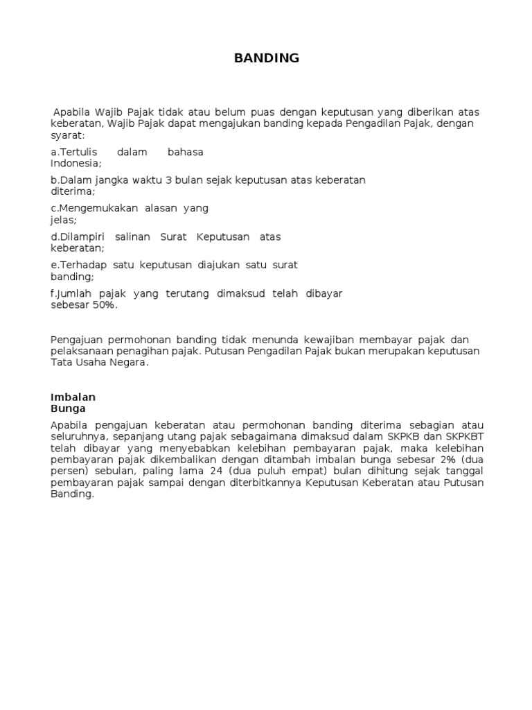 Dan dalam hal kepada Wajib Pajak diterbitkan Surat Ketetapan Pajak Lebih Bayar kepada Wajib Pajak diberikan imbalan bunga sebesar tarif bunga per bulan yang ditetapkan oleh Menteri Keuangan dihitung sejak berakhirnya jangka waktu 12 dua belas bulan sebagaimana dimaksud pada ayat 1 sampai dengan saat diterbitkan Surat Ketetapan Pajak Lebih. Salinan KMK 52 KM10 2020 Tarif Bunga 1-31 Desember 2020pdf. Dalam aturan perpajakan terdahulu tentang pemberian imbalan bunga bagi wajib pajak yang diterima keberatannya maupun bandingnya akan dikembalikan total yang dibayarkan beserta imbalan bunga sebesar 2 perbulan hal ini akibat ketentuan perpajakan sebelumnya mengatur bahwa setiap keberatan dan banding tidak menunda pembayaran pajak yang terutang.