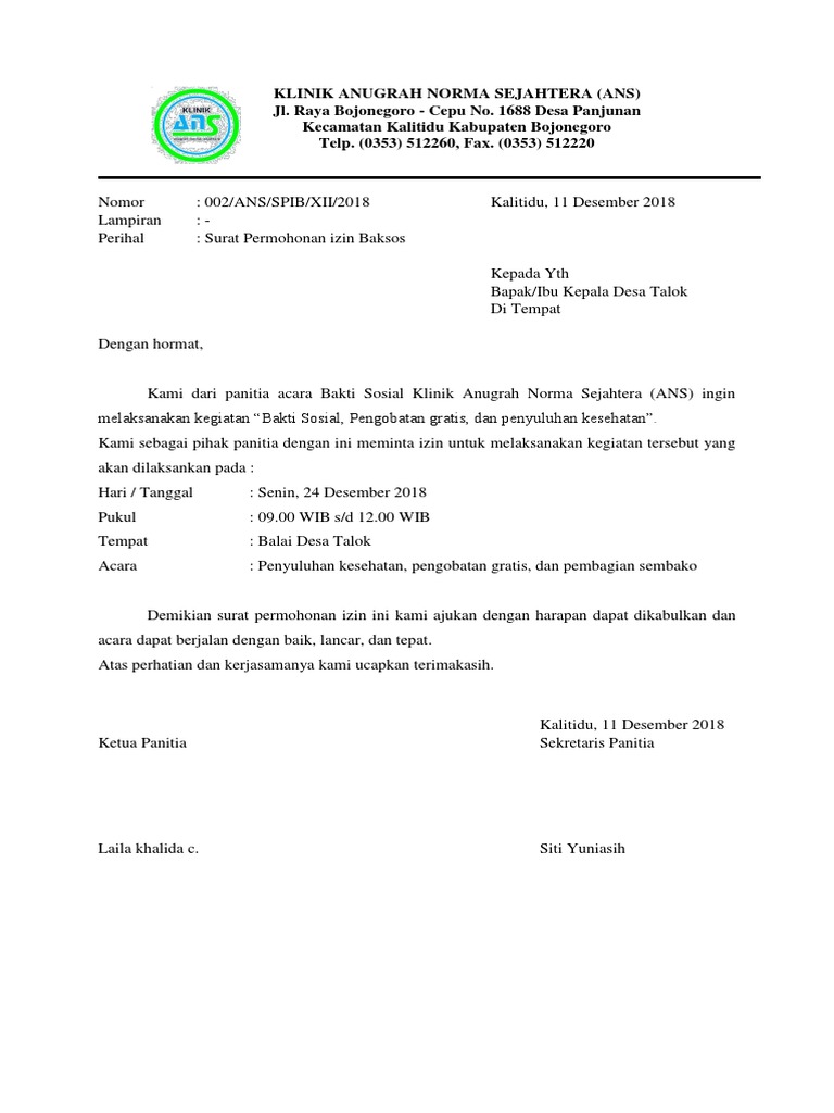 Surat permohonan izin kegiatan baksos. Dimana tentu saja dari sisi penulisan dan bahasa yang digunakan memiliki standar yang berbeda sehingga. Surat pemberitahuan kegiatan bakti sosial digunakan untuk menyemarakkan acara baksos yang anda lakukan. Contoh surat permohonan izin - Seperti surat - surat lainnya yang memiliki beragam jenis di sebabkan oleh tujuan pembuatan dan fungsi surat yang berbeda yang sebelumnya sudah di bahas di blog ini seperti surat permohonan bantuanPada kesempatan kali ini kami akan mencoba menulis surat permohonan izin yang pada intinya tujuan yang di miliki adalah sama yaitu isinya tentang pengajuan permohonan.