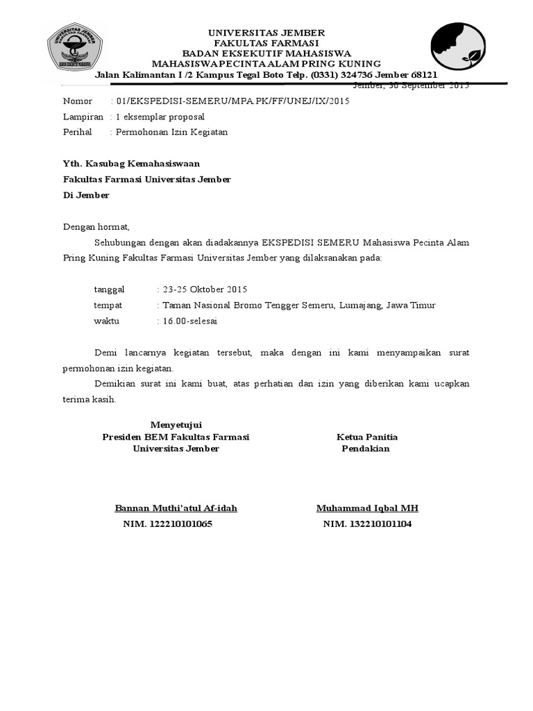 Surat permohonan izin kegiatan kampus. Mengingat hal tersebut maka Surat Ijin Mengikuti Kegiatan Diluar Sekolah perlu dibuat untuk. Sekolah atau kampus biasanya menyelenggarakan kegiatan yang wajib di ikuti oleh siswa atau mahasiswa. Di kampus banyak sekali kegiatan mahasiswa yang terkadang membutuhkan surat izin baik izin dari pihak kampus rektorat izin orang tua ataupun mungkin juga surat izin dari kepala desa setempat bahkan rt rwsurat izin ini tentunya untuk mendukung lancarnya sebuah kegiatan yang akan dilaksanakan kepanitiaan kelompok mahasiswa organisasi kemahasiswaan.