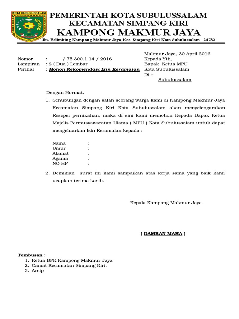 Permohonan izin keramaian kepada yth kapolres. Contoh surat ajuan izin keramaian dari kepolisian ini bisa kalian manfaatkan saat kalian akan mengadakan keramaian acara ada sebuah acara pesantren pengajian acara resepsi pernikahan dan lain sebagainya yang sifatnya mendatangkan banyak orang atau keramaian jadi butuh dengan perizinan mengadakan acara yang mendatangkan banyak orang dengan. Contoh surat permohonan izin keramaianContoh surat izin keramaian yang baik dan benar untuk kegiatan pesta pernikahan di kampung yang dapat diunduh secara gratis dan lengkap contoh surat untuk ibu yang menyentuh hati contoh surat valentine buat pacar.