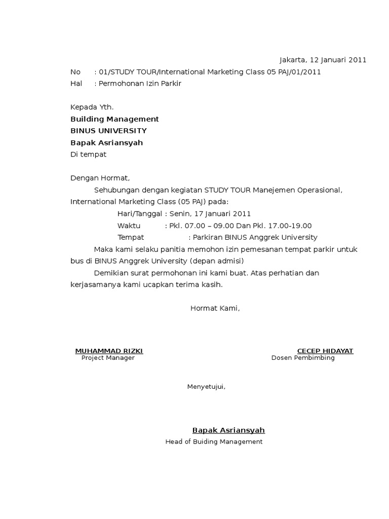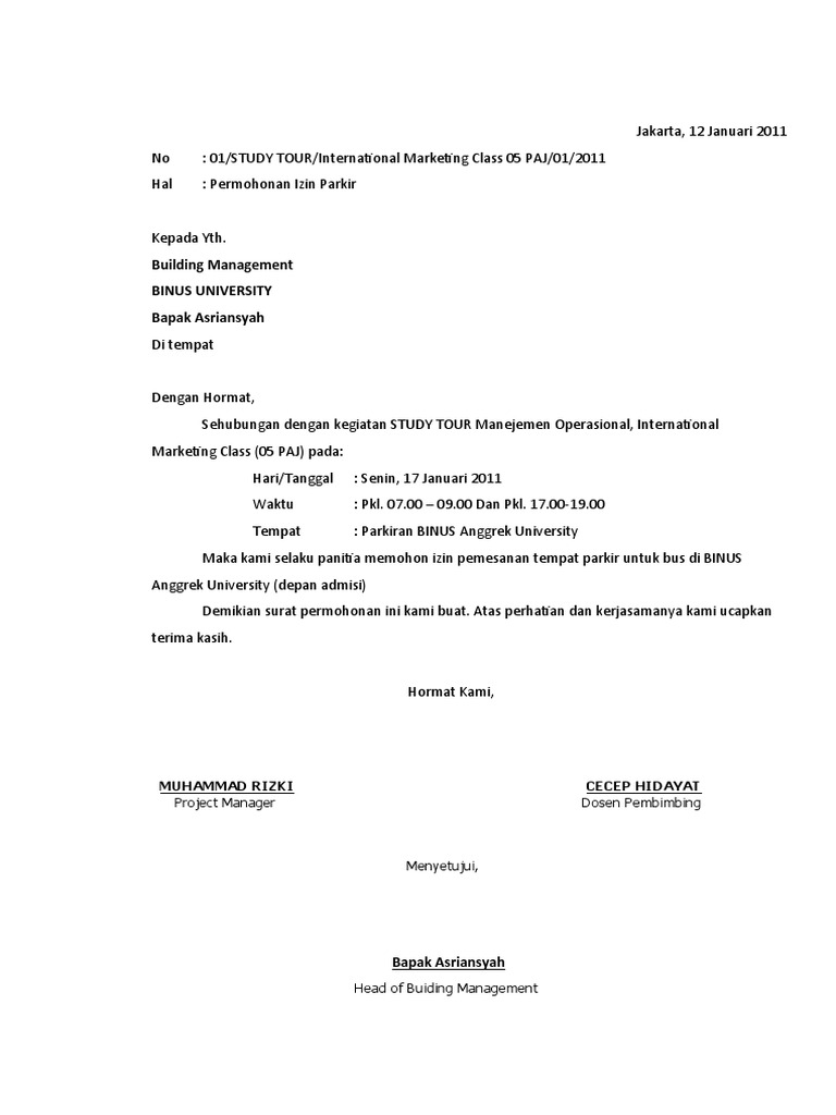 Surat Permohonan Izin Tempat Kegiatan ini bisa anda gunakan untuk permohonan tempat melaksanakan suatu kegiatan seperti kegiatan olah raga atau peringatan hari kemerdekaan. Surat permohonan lahan parkir ke dishub. 01 study tour international marketing class 05 paj 01 2011 hal.