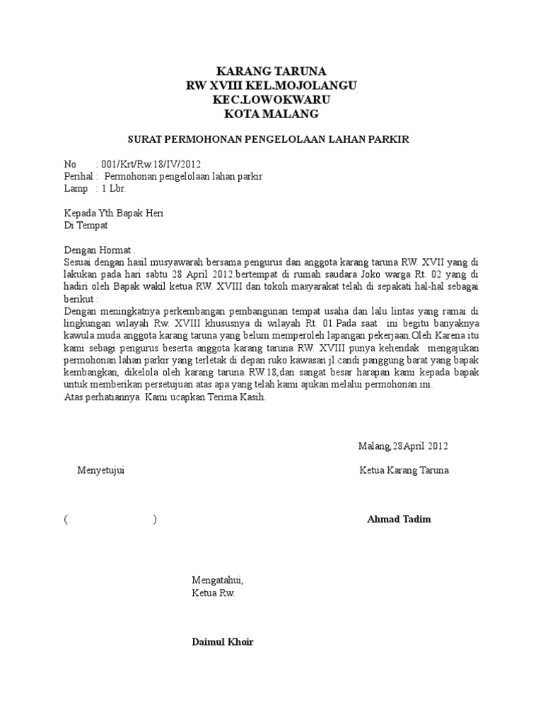 Meminjam lahan parkir kepada pihak lain tentu menjadi solusi yang tepat untuk menyelesaikan masalah ini. Sebelum membuat surat peminjaman tempat ada baiknya jika Anda mencari beberapa contoh surat peminjaman tempat untuk berbagai keperluan di bawah ini tentu saja agar tidak terjadi kesalahan pada saat membuatnya. Surat permohonan adalah surat yang berisi permintaan atau permohonan secara resmi formal kepada seseorang badan ormas instansi atau perusahaan.
