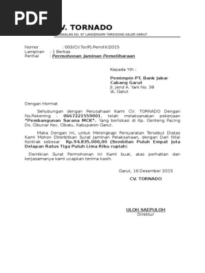Contoh surat permohonan pencairan jaminan pelaksanaan 04 agustus 2017 hai sobat danifin ketika pekerjaan telah anda selesaikan dilaksanakan dan bisa diterima oleh si pemberi kerja lewat berita acara serah terima atau selesainya pekerjaan maka kontraktor tersebut berhak mencairkan jaminan pelaksanaan. Surat Permohonan Jaminan Pelaksanaan Puskesmas Dongkaldoc jlk9w0d7x045. Perpres No16 Tahun 2018 Pasal 33 1 Jaminan Pelaksanaan sebagaimana dimaksud dalam Pasal 30 ayat 1 huruf c diberlakukan untuk Kontrak Pengadaan BarangPekerjaan KonstruksiJasa Lainnya dengan nilai paling sedikit di atas Rp20000000000 dua ra.