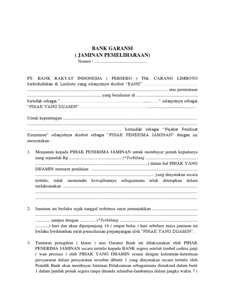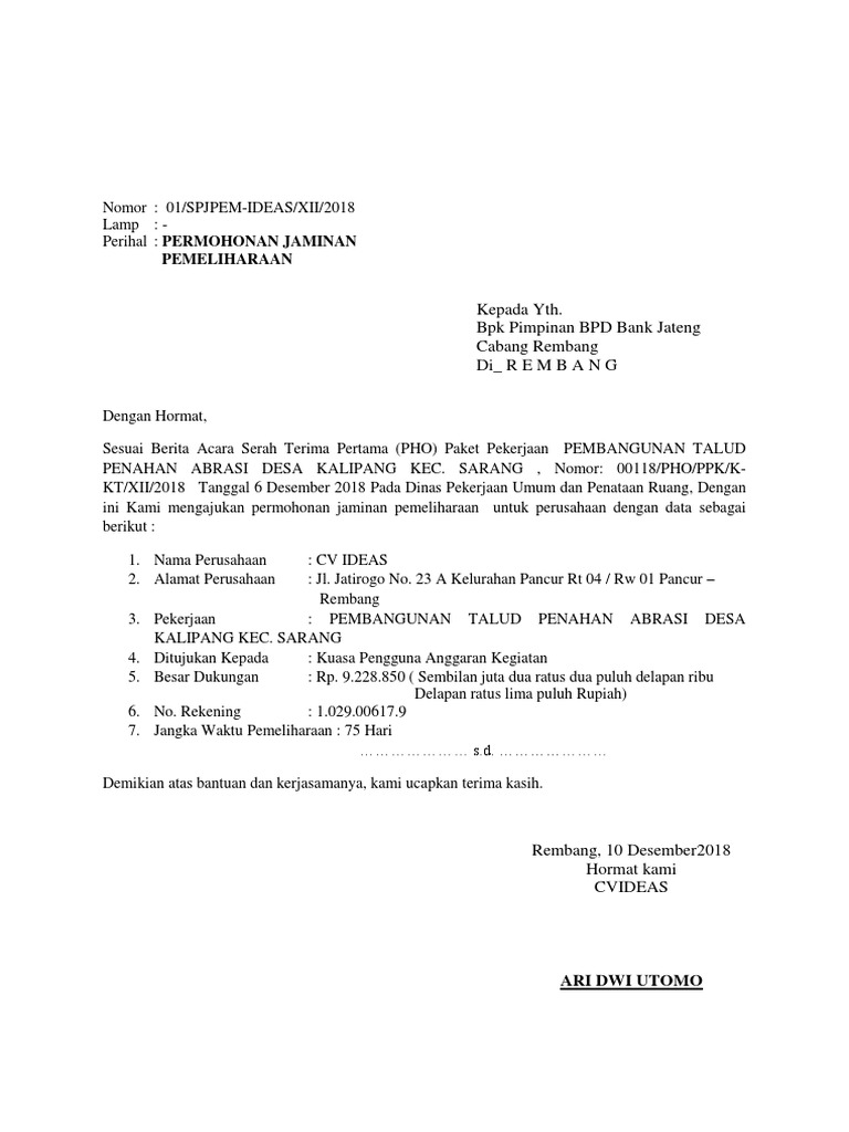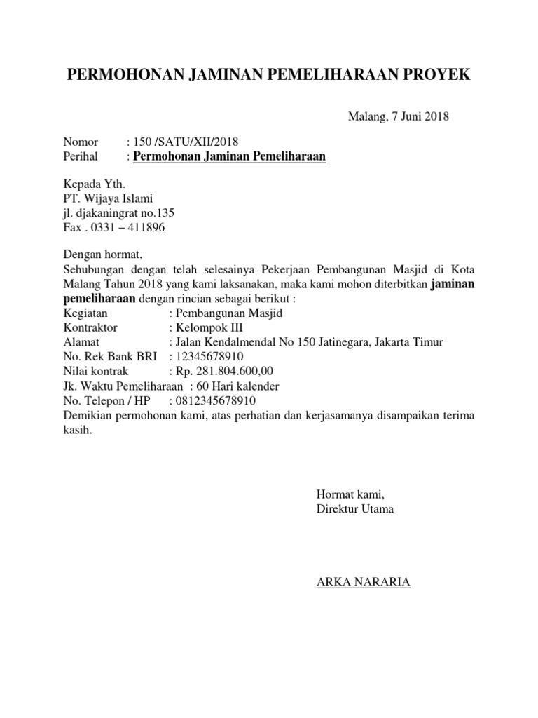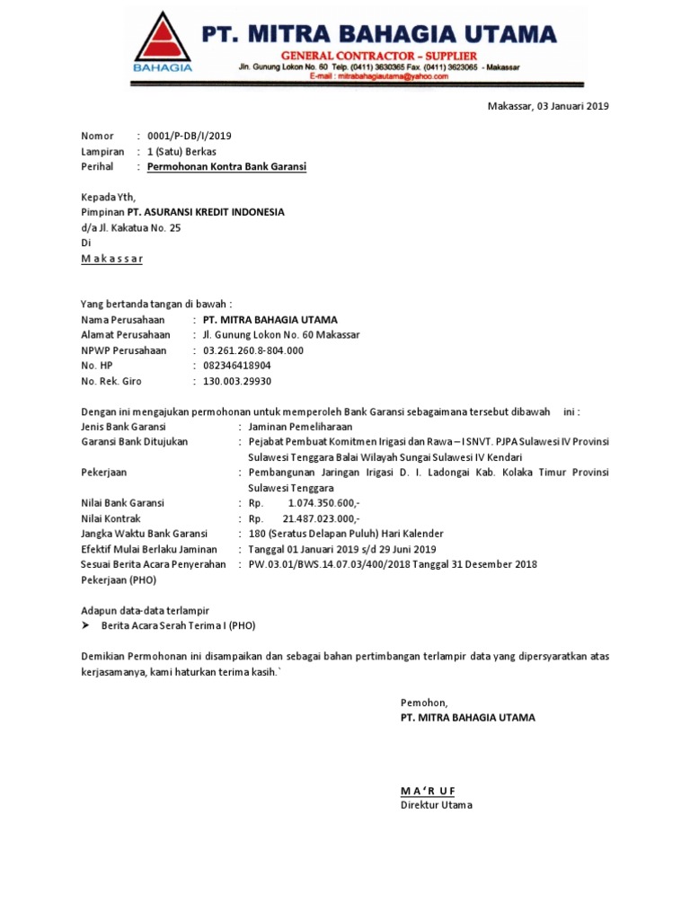 Surat permohonan jaminan pemeliharaan. Jaminan Penawaran Perencanaan Pengadaan Barang dan Jasa Identifikasi Kebutuhan. Surat Jaminan atau disebut dengan Jaminan adalah jaminan tertulis yang dikeluarkan. Apabila pekerjaan telah selesai 100 maka dimintakan Jaminan Pemeliharaan Maintenance Bond sebagai jaminan bila ada kerusakankerugian pasca pekerjaan.