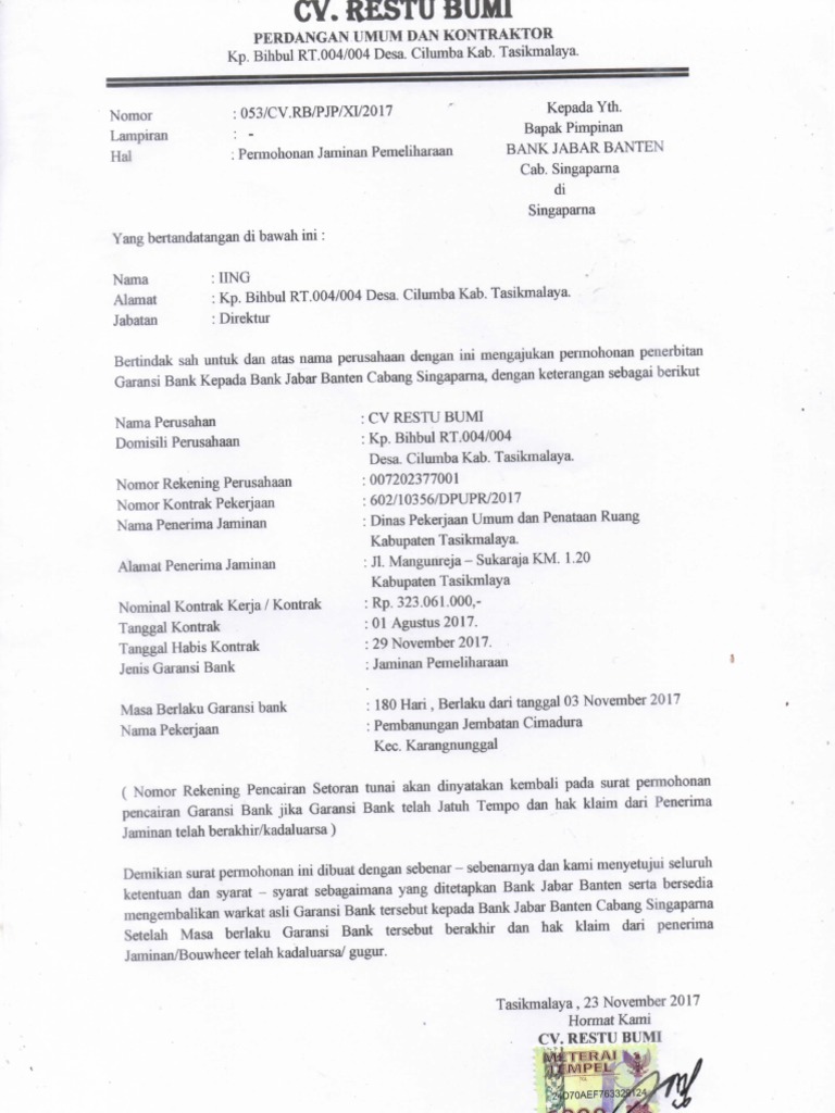 CONTOH SURAT PERMOHONAN JAMINAN PEMELIHARAAN. 1 Jika Pengajuan untuk Pekerjaan Pengadaan BarangJasa maka harus dilampirkan. Petugas Front Office memeriksa permohonan dan membuat tanda terima permohonan.