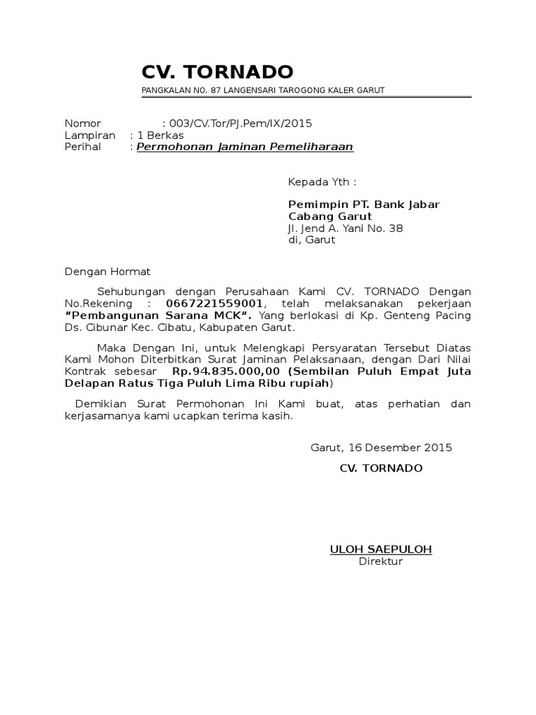 Surat permohonan jaminan pemeliharaan bank. Surat Pernyataan Keabsahanan Jaminan Bank. ContohPermohonan Bank Garansi KOP SURAT PERUSAHAAN. Sanggah Banding Jaminan Pelaksanaan dan Jaminan Pemeliharaan.