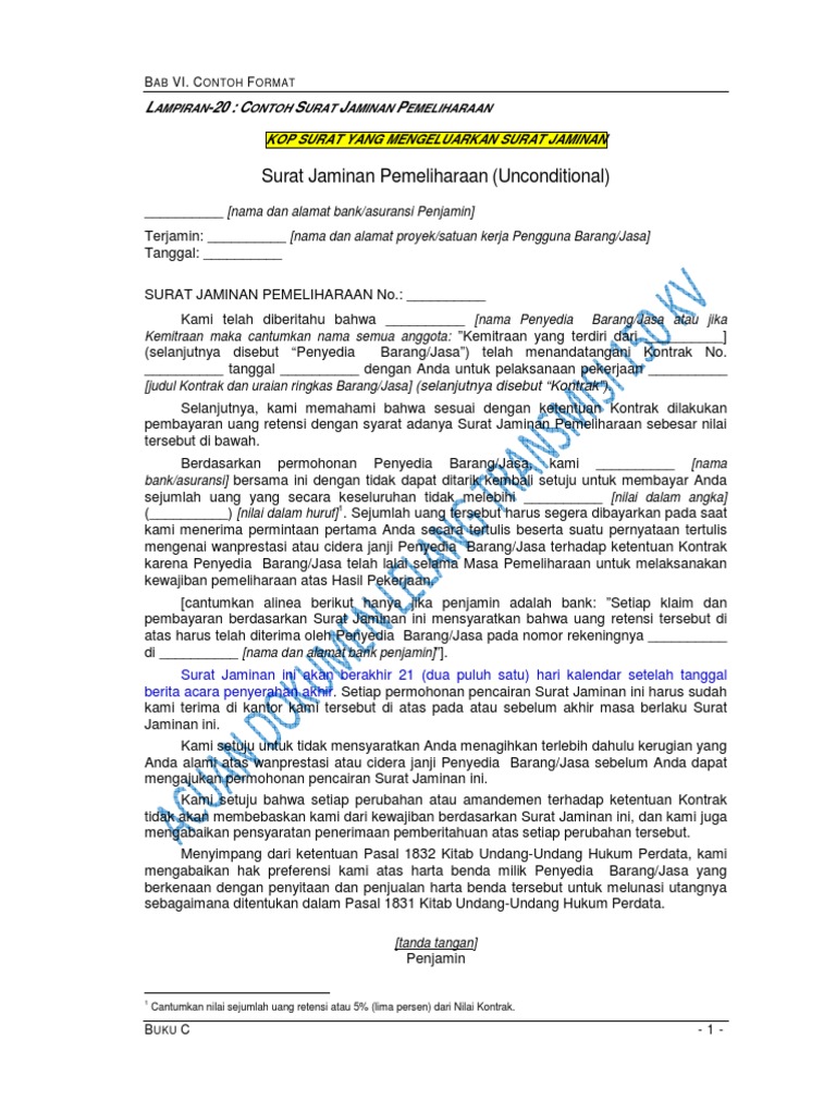2 Memblokir membuka blokir. Surat Kuasa Pencairan Jaminan Bank Lamp. Jaminan pembayaran adalah jaminan atas pembayaran yang akan dilakukan atas pekerjaan fisik pemeliharaan gedung penyediaan makananlauk pauk dan kegiatan sejenis lainnya yang dilaksanakan secara kontraktual yang diperkirakan pekerjaan tersebut dapat diselesaikan antara tanggal 18-31 Desember 2012.