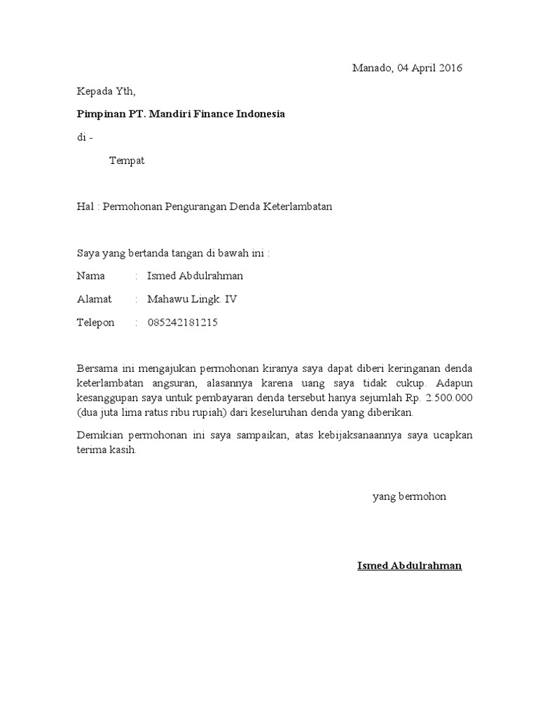 Sedangkan di tahun 2018 kita sedang mendapatkan rejeki yang melimpah dan berniat untuk melunasi maka kita akan di kenakan denda karena keluar dari perjanjian. Permohonan keringanan ini terpaksa saya ajukan dikarenakan saya mengalami kesulitan mengangsur tiap bulannya memohon agar bank mandiri menghapuskan bunga pinjaman. Contoh Surat Permohonan Penghapusan Denda Kredit 1.