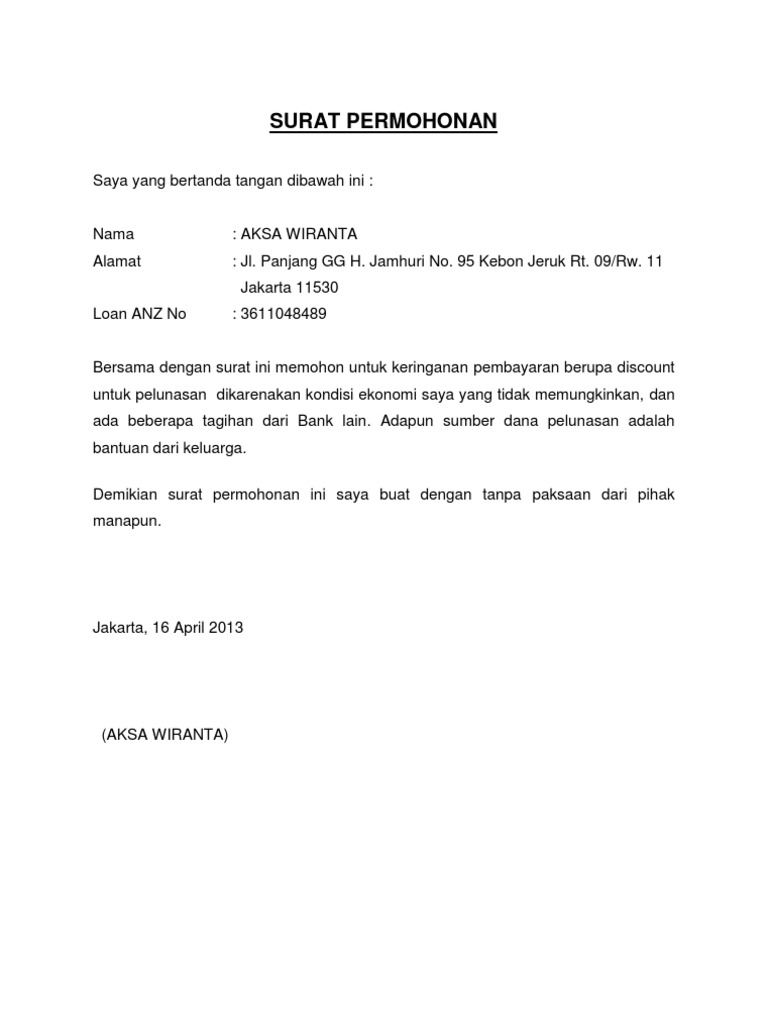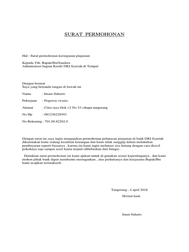 Surat permohonan keringanan pelunasan. Saya memiliki tunggakan KTA Kredit Tanpa Agunan di Bank DBS dengan nomor 7702657439. Meski kamu diharuskan untuk membayar. Surat permohonan keringanan pelunasan hutang bank.