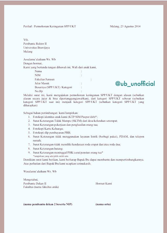 Surat permohonan keringanan ukt ub. 2 Pengajuan permohonan Keringanan UKTSPPSPFP yang melewati batas waktu sebagaimana dimaksud pada ayat 1 dinyatakan tidak dapat diterima. Permohonan keringanan spp ukt malang 23 agustus 2014 yth. Demikian surat ini kami sampaikan semoga bapakibu dapat mengabulkan permohonan kami.