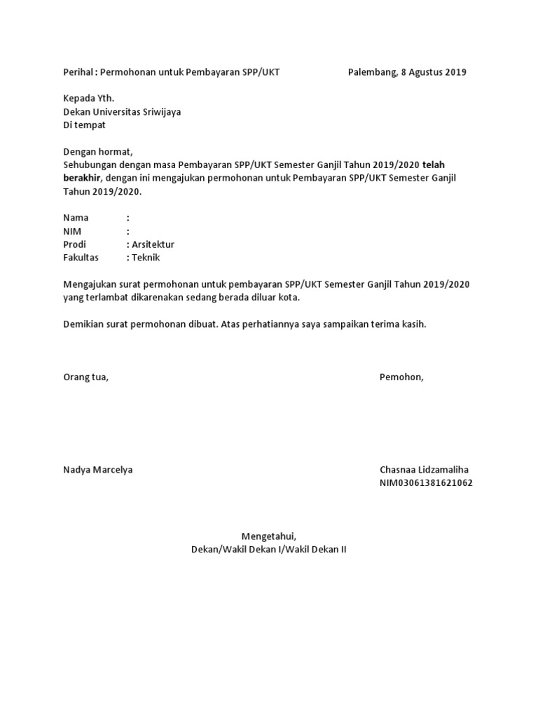 RT 02 RW 02 Dusun Seumberagung Desa Sumberagung Kecamatan Perak Kabupaten Jombang. Surat Permohonan Penurunan Ukt Academiaedu is a platform for academics to share research papers. Yth Pembantu Direktur II Politeknik Negeri Sriwijaya Palembang Dengan Hormat Sehubungan dengan proses pendaftaran ulang bagi mahasiswa baru program alih jenjang di Politeknik Negeri Sriwijaya Palembang Saya yang bertanda tangan di bawah ini memohon maaf sebesar-besarnya atas keterlambatan dalam proses pembayaran biaya pendaftaran ulang tersebut untuk program.