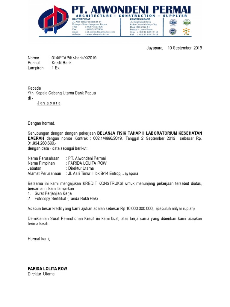 Memiliki usaha tetap dan memiliki omset harian. Disini kita ambil contoh surat perohonan pinjaman dari bank Tabungan Negara BTN. Permohonan kredit kepada Bank Papua dengan memberikan informasi tentang.