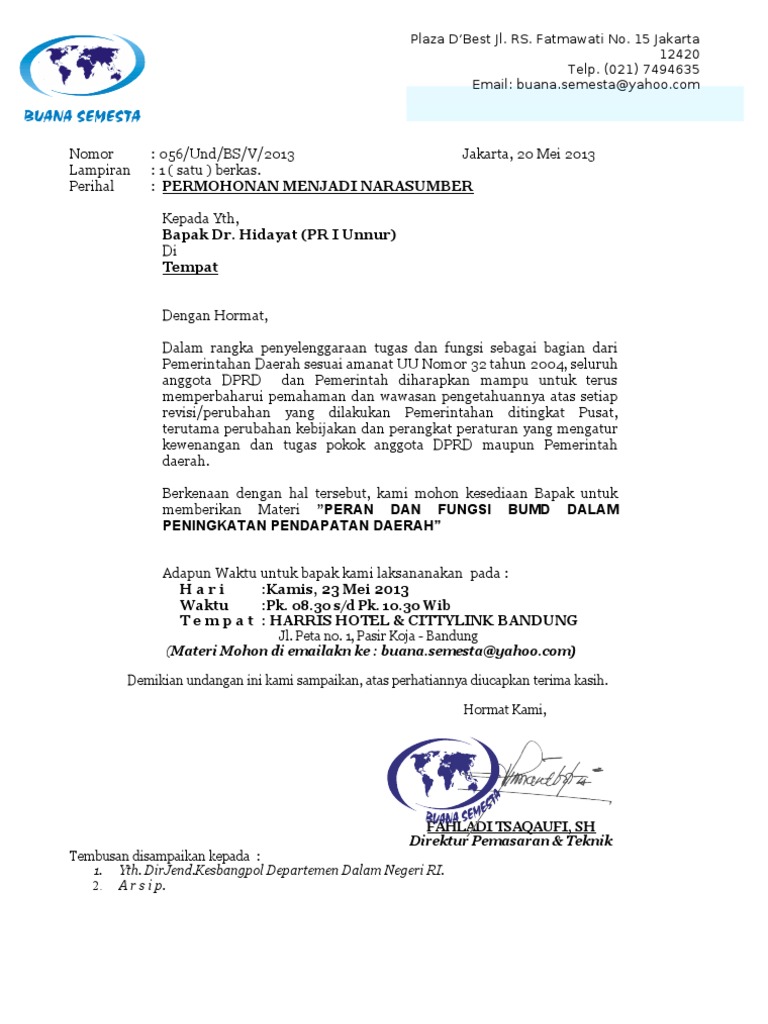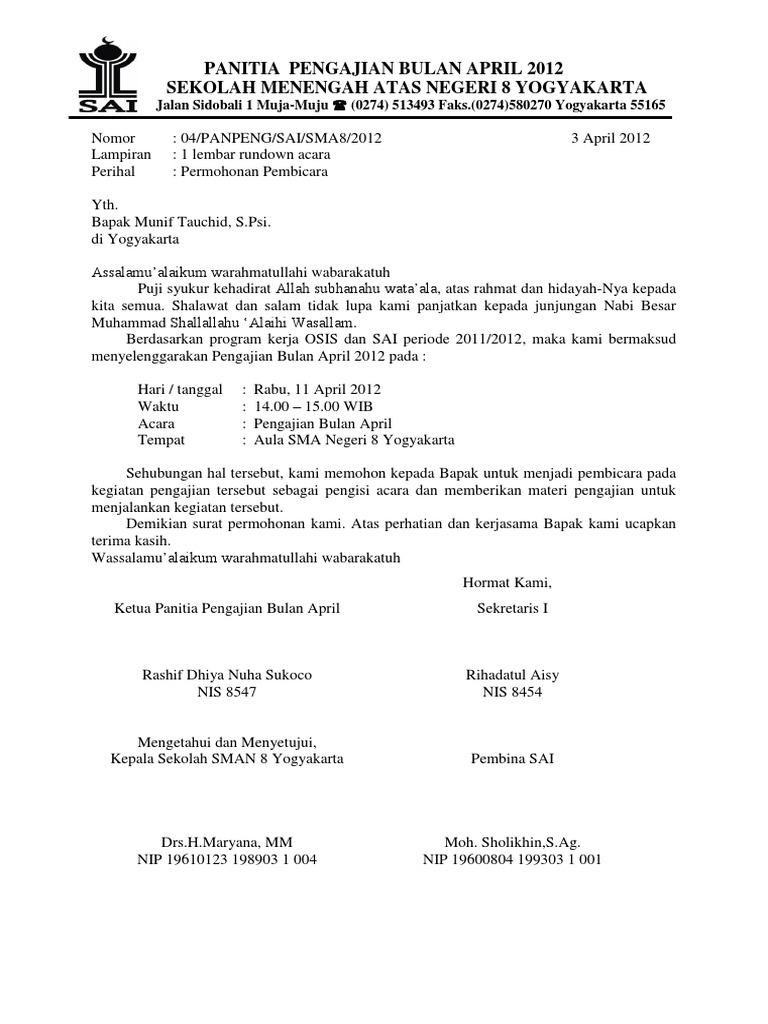 Surat permohonan menjadi pembicara pengajian. Contoh format surat permohonan narasumber dibutuhkan oleh sebuah organisasi yang ingin menyelenggarakan workshop atau pelatihan untuk bisa mendapatkan pembicara yang sesuai dengan tema kegiatan yang akan diselenggarakan. Surat permohonan narasumber merupakan sebuah surat yang di dalamnya berisi permohonan atau permintaan kepada seseorang mengenai apakah orang tersebut bersedia untuk menjadi narasumber di sebuah acara tertentu atau tidaksurat permohonan yang diajukan ini bukan hanya untuk acara yang berhubungan dengan instansi pemerintahan melainkan juga. Nganjuk 23 Mei 2018 Kepala SMKN Samendika Nganjuk.