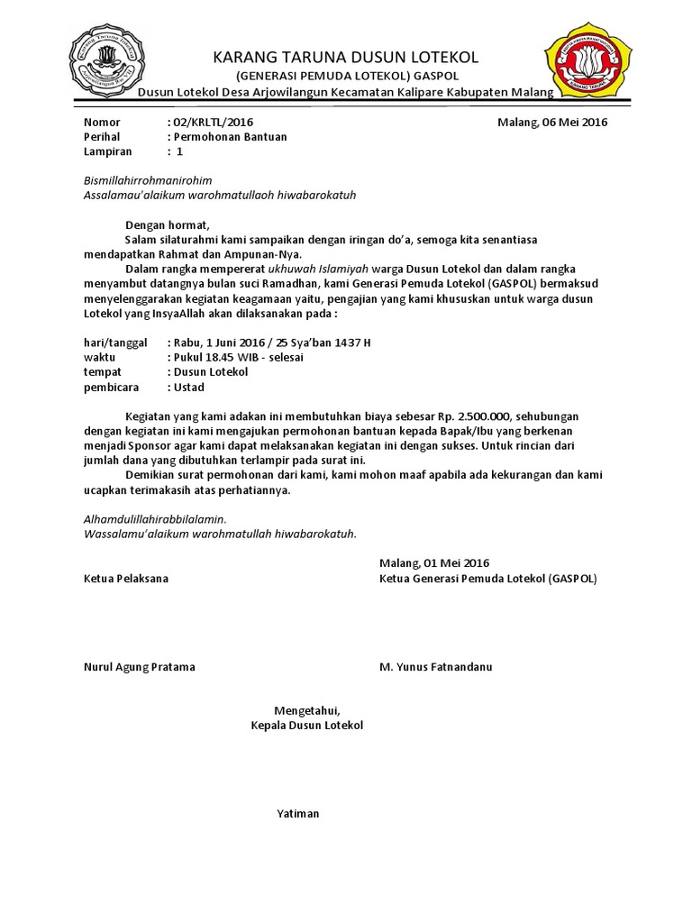 Biasanya para mahasiswai yang terlibat dalam program yang mengharuskan bertemu dengan masyarakat sangat membutuhkan narasumber atau pembicara yang baik. Kegiatan Organisasi Kampus Eksternal Kampus Maupun Instansi Pemerintahan Formal dan Non-Formal untuk membaca artikel selengkapnya dengan klik link di atas. Untuk meminta bantuan dana kepada pihak sponsor Anda perlu membuat surat permohonan yang resmi.