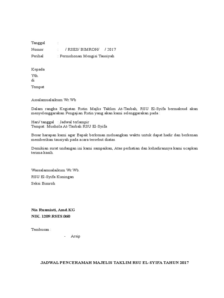 Surat Permohonan Menjadi Pembicara Pengajian