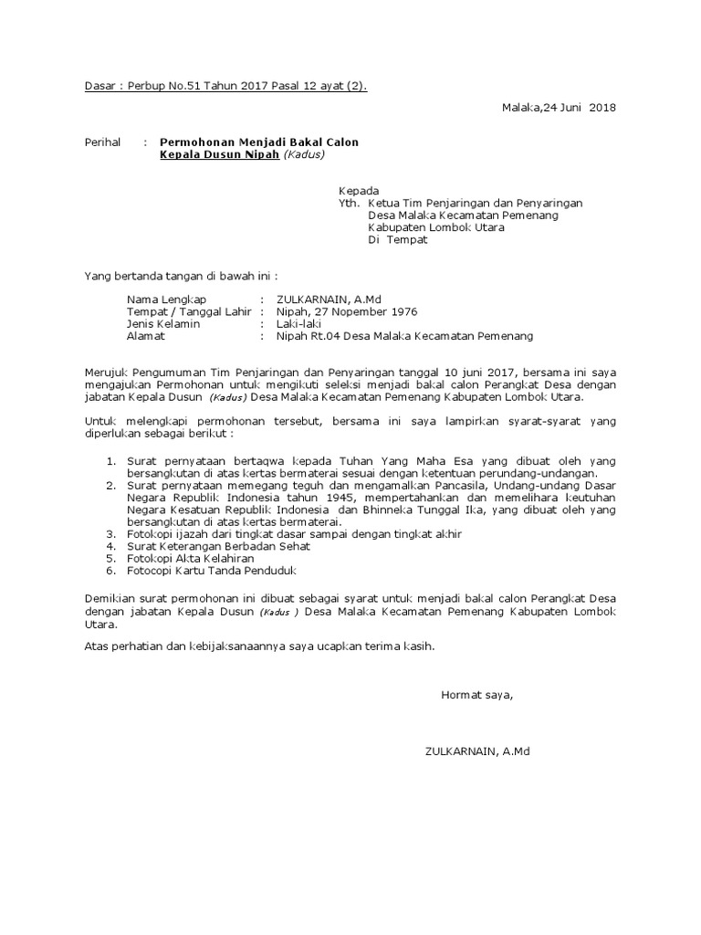 Surat Permohonan Menjadi Perangkat Desa 2018
