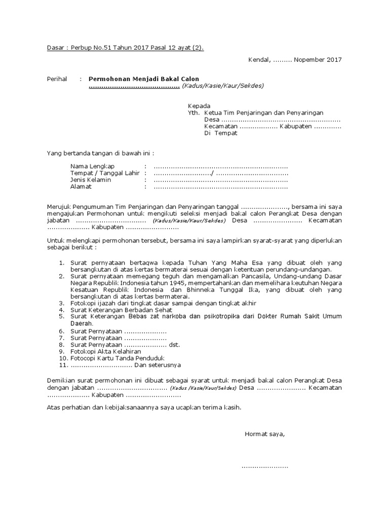 Tentunya pada saat melakukan penyaringan jabatan Perangkat Desa dilakukan pengisian formulir dan seleksi sesuai prosedur yang berlaku. Contoh Surat Lamaran Perangkat Desa Contoh format surat permohonan pencalonan perangkat desa untuk segala posisi hal hal yang mesti terdapat pada surat sah pada umumnya pun harus terdapat pada surat permohonan. Contoh Surat Permohonan Menjadi Bakal Calon Perangkat Desa atau Sekretaris Desa berdasarkan Peraturan Bupati Kendal No51 Tahun 2017 Pasal 12 ayat 2.