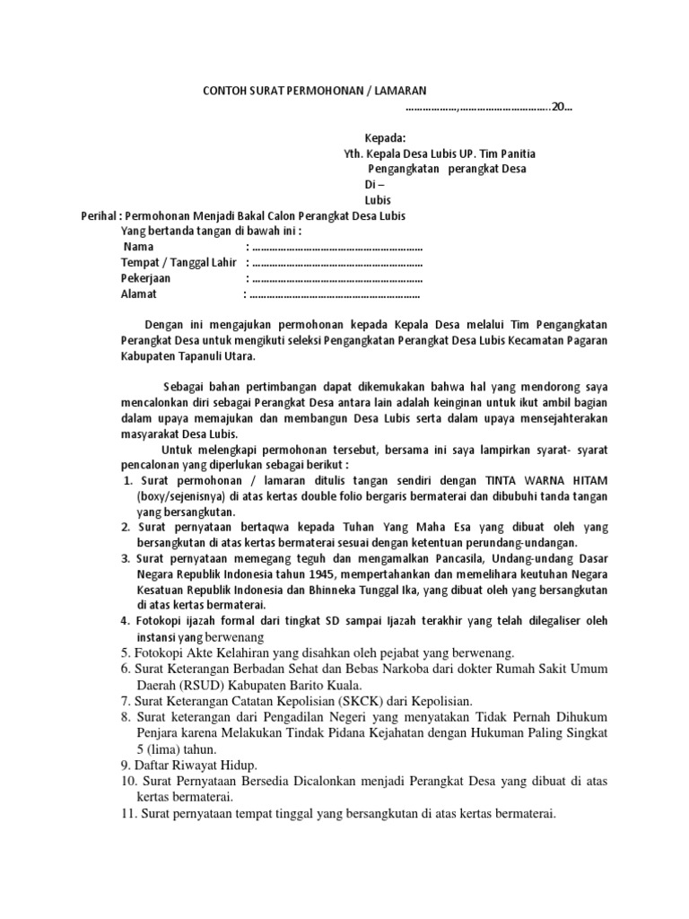 Surat permohonan menjadi perangkat desa bermaterai. Syarat Domisili Dihapus Dulu sebelum adanya putusan perkara Mahkamah Konstitusi MK Nomor 128PUU-XIII2015 syarat umum lainnya selain yang sudah. Surat Pernyataan setia pd Pancasila NKRI dan UUD 45 silakan kunjungi link ini. Contoh surat permohonan melamar sebagai perangkat desa kang aep.