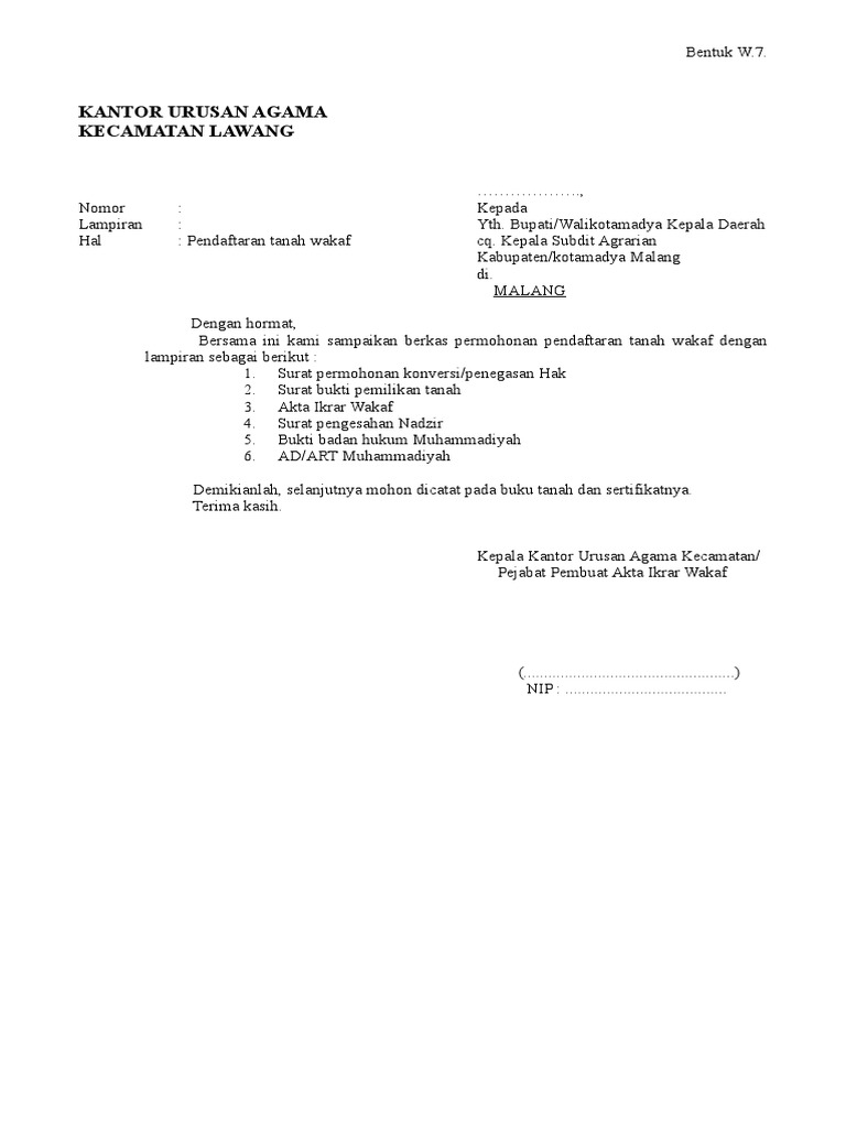 Surat permohonan nadzir wakaf. 24 Tahun 1990 tentang Sertifikat Tanah Wakaf. Instruksi Menteri Agama dan Kepala BPN No. Persyaratan umum penggantian Nadzir.