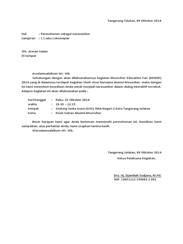 Mirip dengan surat undangan tepatnya tetapi karena kita belum tahu apakah orang tersebut mau atau tidak menjadi narasumber maka lebih tepatnya dibuat surat permohonan narasumber. PPPA Daarul Quran sebuah lembaga pengelola sedekah yang berkhidmat kepada program sosial kemanusian dan dakwah berbasis Tahfidzul Quran. Berikut adalah contoh surat permohonan kepada seorang narasumber untuk mengisi sebuah acara yang akan diadakan contoh dibawah adalah acara pembahasan tentang fiqh wanitajika acaranya berbeda isi suratnya dapat disesuaikan dengan kondisi atau situasi acara yang akan diadakan.