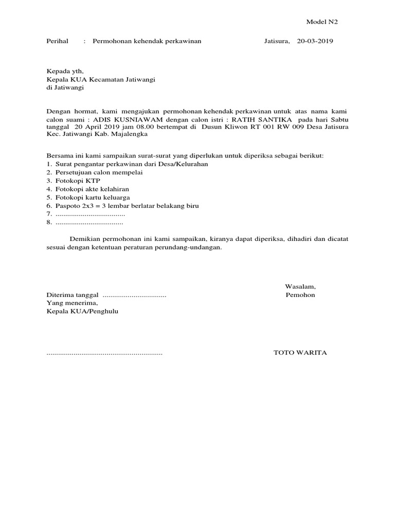 Surat permohonan nikah kua. Adapun dokumen yang harus dibawa seperti berikut ini. Surat keterangan untuk nikah model N1 Surat keterangan asal-usul model N2 Surat persetujuan mempelai model N3. Syarat mengurus surat nikah di KUA ternyata tidak sesulit yang dibayangkan asalkan kamu sudah melengkapi seluruh persyaratan yang telah di tentukan juga mengetahui alur atau proses pengurusan surat tersebut.