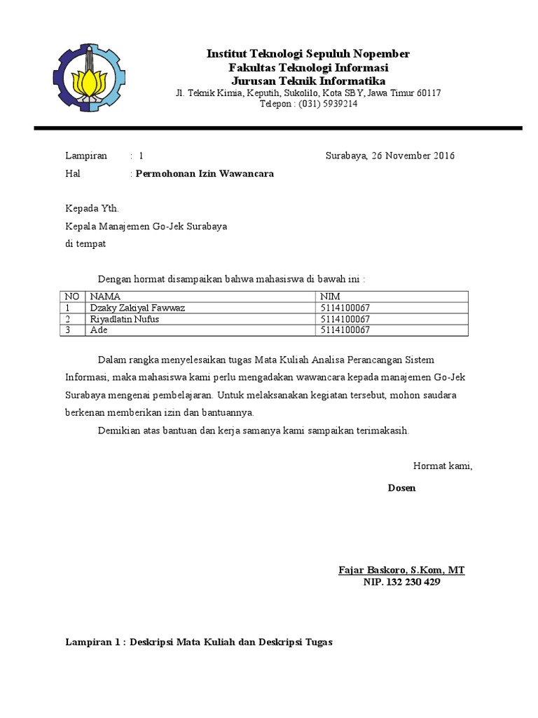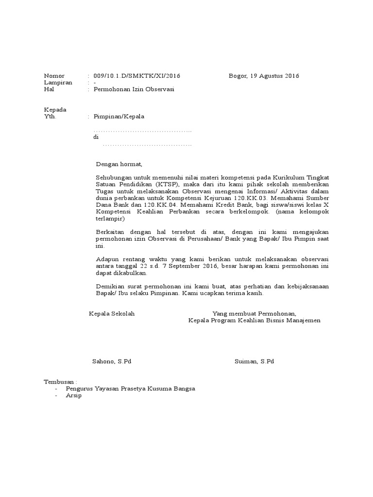 Surat ini ditulis oleh perseorangan tapi digunakan untuk mewakili suatu organisasi instansi atau juga suatu badan usaha yang ditujukuan untuk individu organisasi instansi atau badan usaha dengan format dan bahasa yang baku. Surat permohonan ini dibuat oleh pihak UniversitasKampus jika lingkup kampus yang luas surat ini akan dikeluarkan oleh Bagian JurusanProgram Studi namun pada kasus. Contoh Surat Izin Observasi Penelitian.