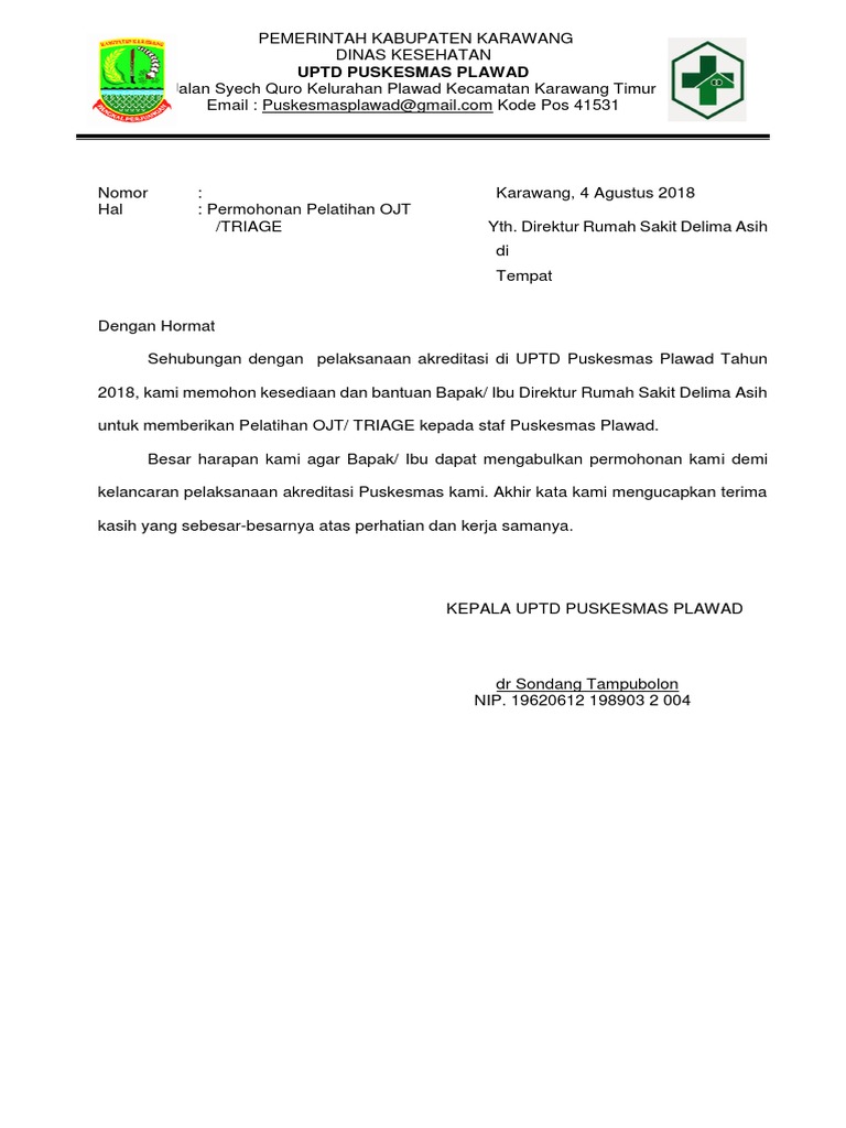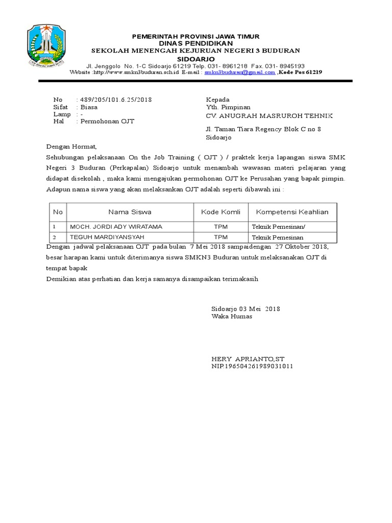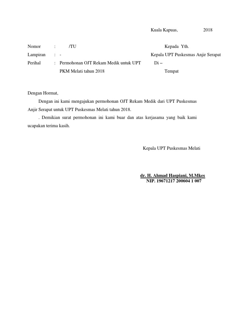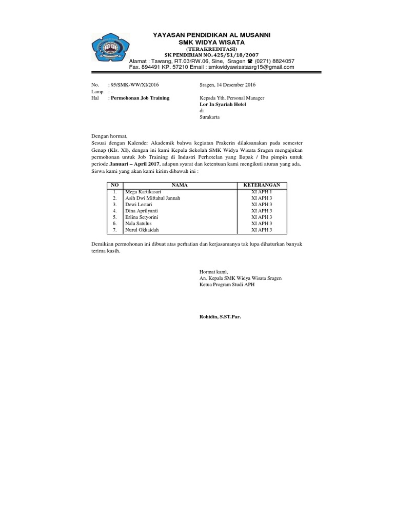 Surat permohonan ojt. Surat keterangan bersifat terbuka atau tidak rahasia. Jika surat permohonan magangPKL dikirimkan oleh pihak kampus maka akan dilampirkan nama para mahasiswa yang tertarik untuk magang disana. Berikut salah santu contoh sederhana surat lamaran untuk on the job training OJT ke salah satu Hotel yang ada di Bandung.