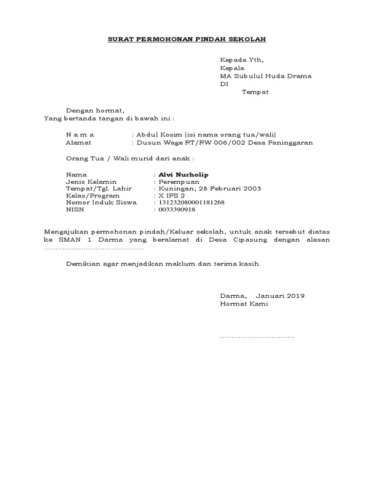 Surat permohonan orang tua tentang mutasi masuk peserta didik ke sekolah yang dituju. Surat keterangan pindah dari Satuan Pendidikan asal diketahui Dinas PendidikanSuku Dinas Pendidikan setempat. 6000- ke Satuan Pendidikan tujuan. Contoh Surat Permohonan Mutasi Dalam dunia kerja mutasi adalah hal yang lumrah kita temukan.