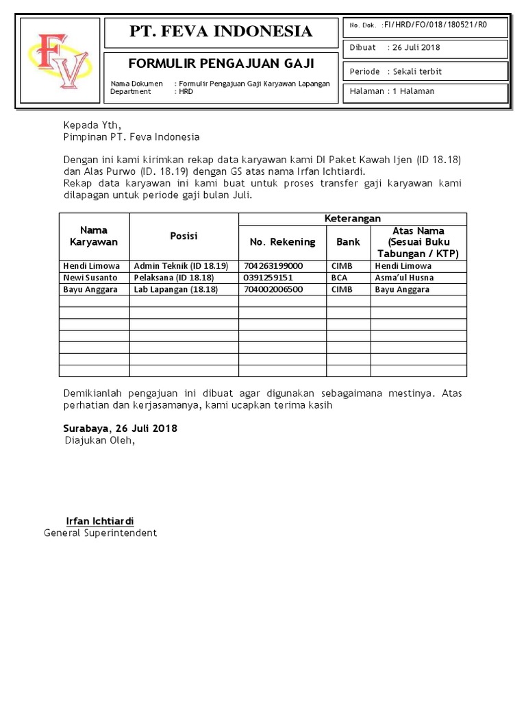 Surat permohonan slip gaji. 12 Mei 2013 Merujuk pada tingkat biaya operasional hidup yang terus mengalami kenaikan dan mempertimbangkan. Kepada Yth Pimpinan PT.