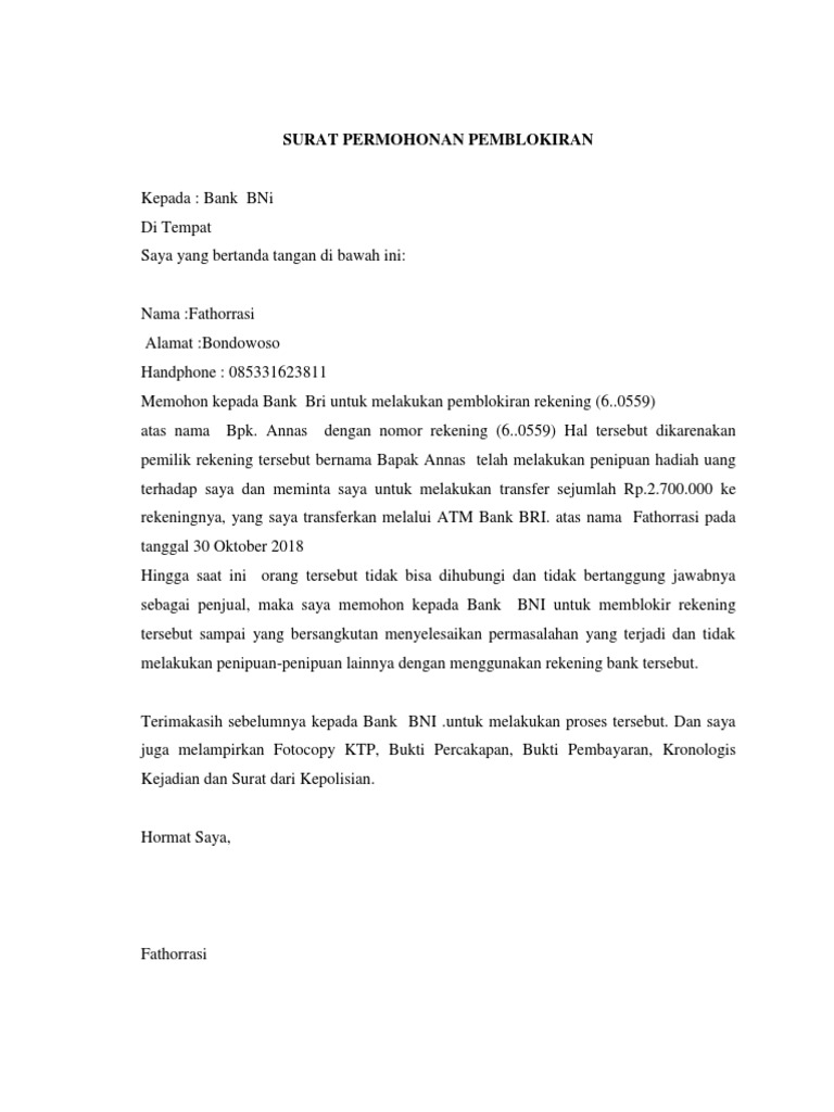 Surat permohonan pemblokiran rekening bri. Demikianlah contoh surat permohonan pembukaan. Bank Rakyat Indonesia Persero Tbk. Berikut ini Anda bisa lansung Copypaste Contoh Surat Permohonan Pembuatan Pembukaan Rekening Bank BRI Semoga contoh surat ini dapat melengkapi administrasi Anda.