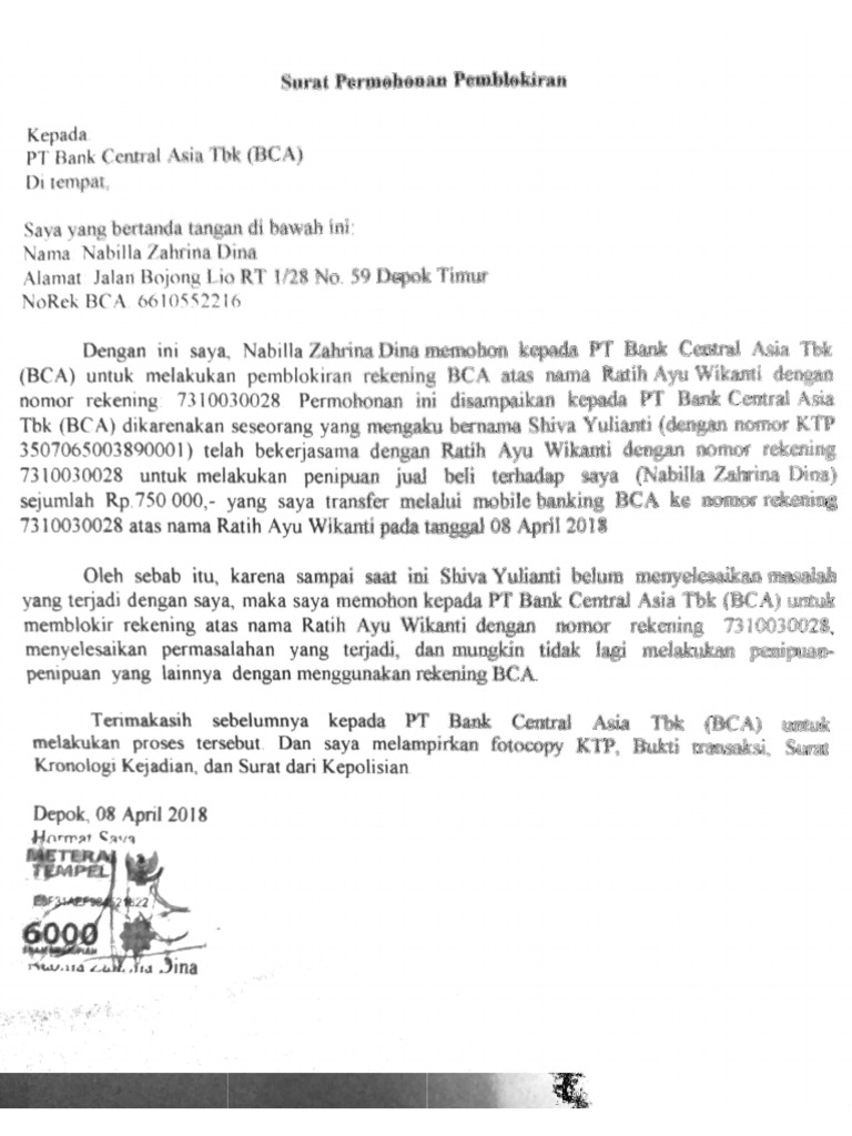 Surat permohonan pemblokiran rekening penipu. Surat permohonan pembukaan rekening baru. Namun disinilah anda akan sedikit bersusah karena saat di bank inilah besar kemungkinan pihak bank tidak dapat memblokir rekening tanpa permintaan nasabah itu sendiri sehingga tunjukkan kemampuan anda anda harus berani agar bank mau menindak lanjuti kasus ini gunakan. Contoh Surat Permohonan Pemblokiran Ke BCA.