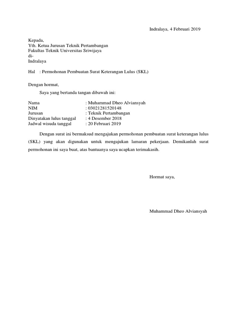 FORMULIR PERMOHONAN SKL FEBI 2020docx. Dalam pembuatan surat permohonan yang paling penting dan utama untuk diperhatikan yaitu pada penulisan identitas serta tujuannya yang harus benar dan jelas. Mengajukan permohonan untuk pembuatan Surat Kelulusan Sementara SKL yang digunakan untuk kepentingan syarat melamar pekerjaan.