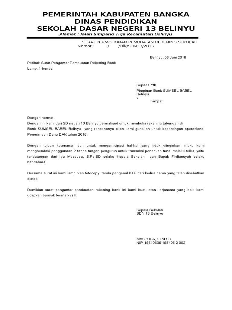 Surat permohonan pembukaan rekening bank untuk sekolah. 60 5 60 menganggap dokumen ini bermanfaat. Seo Sunda - Siang ini kami memberikan contoh Surat Permohonan Pembukaan Rekening Baru untuk keperluan Bantuan Operasional Sekolah BOS BOP. Surat Permohonan Pembukaan Rekening Sekolah adalah surat permohonan untuk membuat atau membuka rekening untuk dan atas nama Sekolah yang ditujukan kepada pihak Bank.