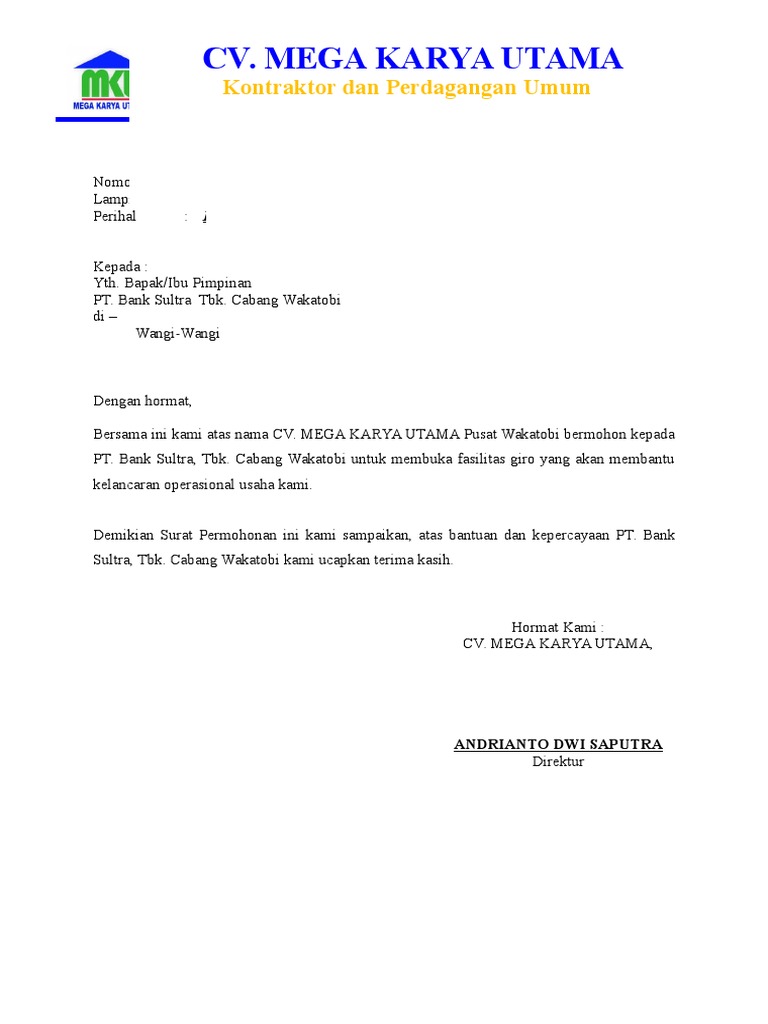 Surat permohonan pembukaan rekening cv. Untuk membuka rekening baru anda cuma butuh waktu beberapa menit saja rekening anda di bank tersebut pun jadi. Contoh Surat Permohonan Pembukaan Rekening Perusahaan PTCV Surat Permohonan Pembukaan Rekening Perusahaan adalah surat permohonan yang ditujukan kepada pihak Bank untuk membuat atau membuka rekening untuk dan atas nama PerusahaanKorporasi baik itu PT maupun CV. Skip to main content CONTOH SURAT ORTON Kumpulan Contoh Surat Makalah Soal dan Tugas Sekolah.