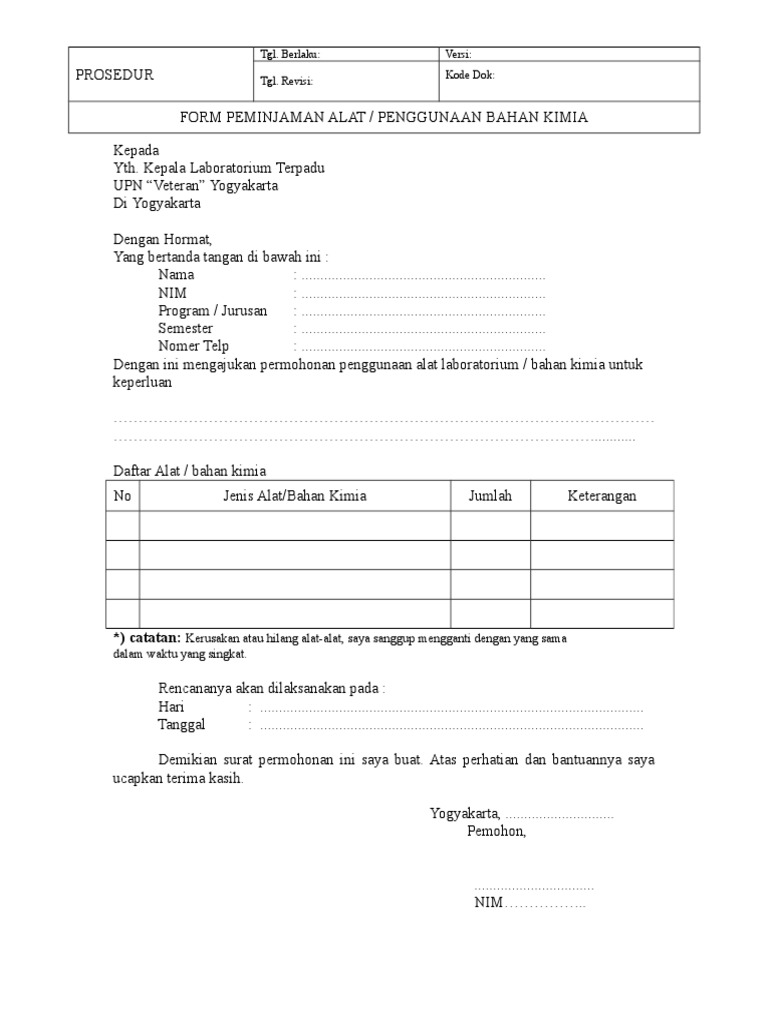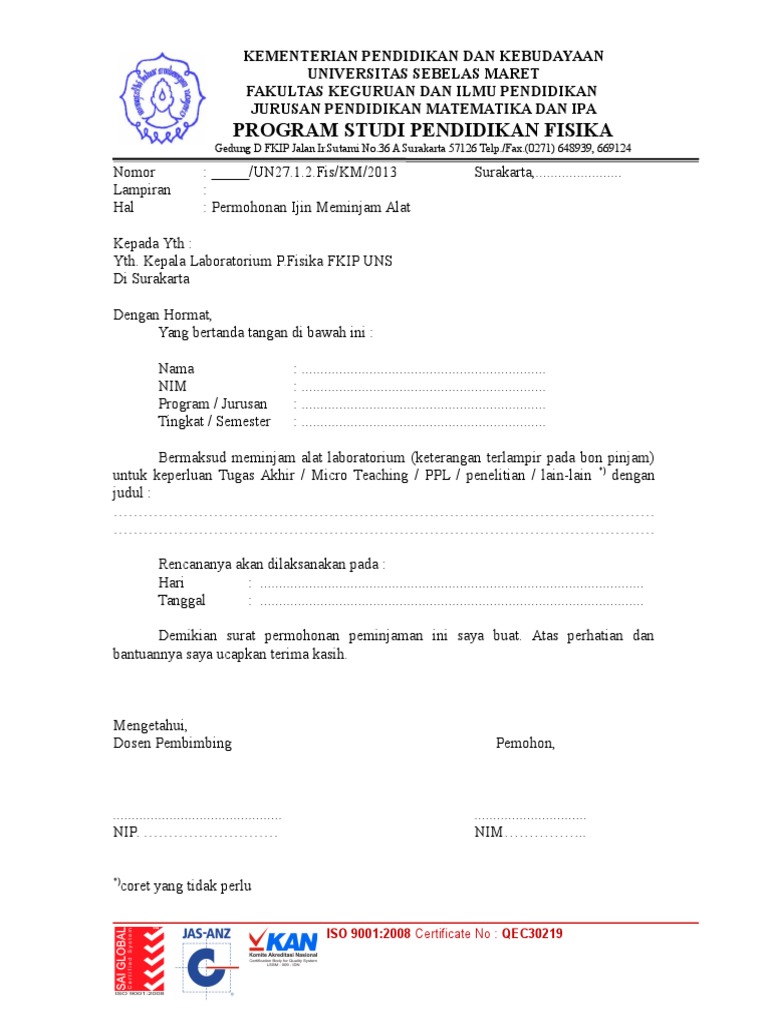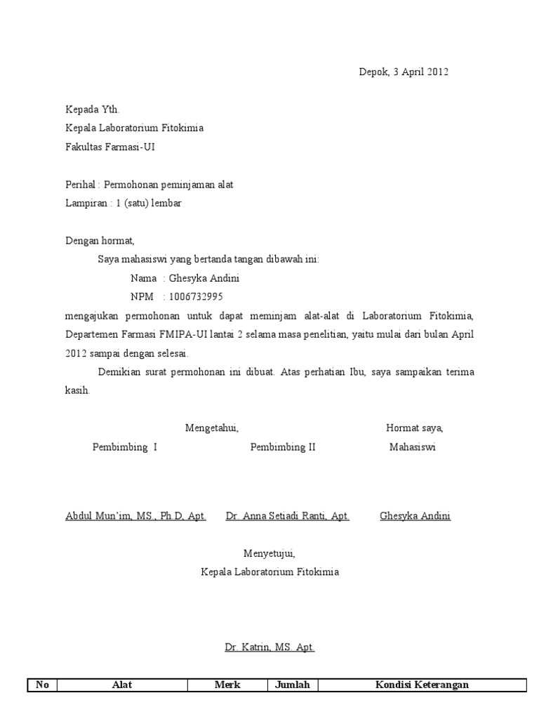 Berikut contohtemplate surat peminjaman labalat dan bebas lab 2018. Sebuah surat permohonan peminjaman biasanya ditujukan untuk pinjam meminjam alat yang digunakan sebuah organisasi atau instansi resmi. Permasalahan Nilai Magang Surat Pernyataan bagi Mahasiswa Angkatan 2014 Pendaftaran Asisten Praktikum Lab.