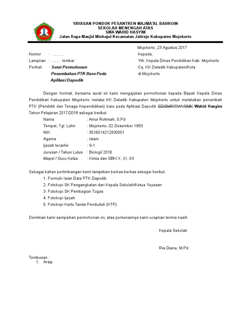 Surat permohonan penambahan ptk baru dari kepala sekolah doc. DAPODIKCOID - Surat Permohonan Penambahan PTK Baru Dapodik jenjang PAUD SD SMP SMA dan SMK Doc. Salam jumpa kembali sahabat pembaca setia blog dapodikcoid dimanapun anda berada. Surat Pengunduran diri PTK jika ada pemberhentian PTK dari Kepala sekolah 4.