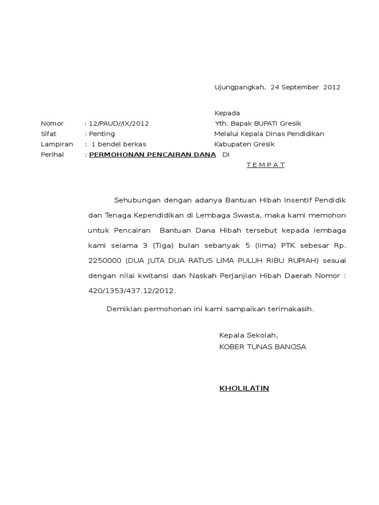 Surat Permohonan Pencairan Bantuan Dana Hibah