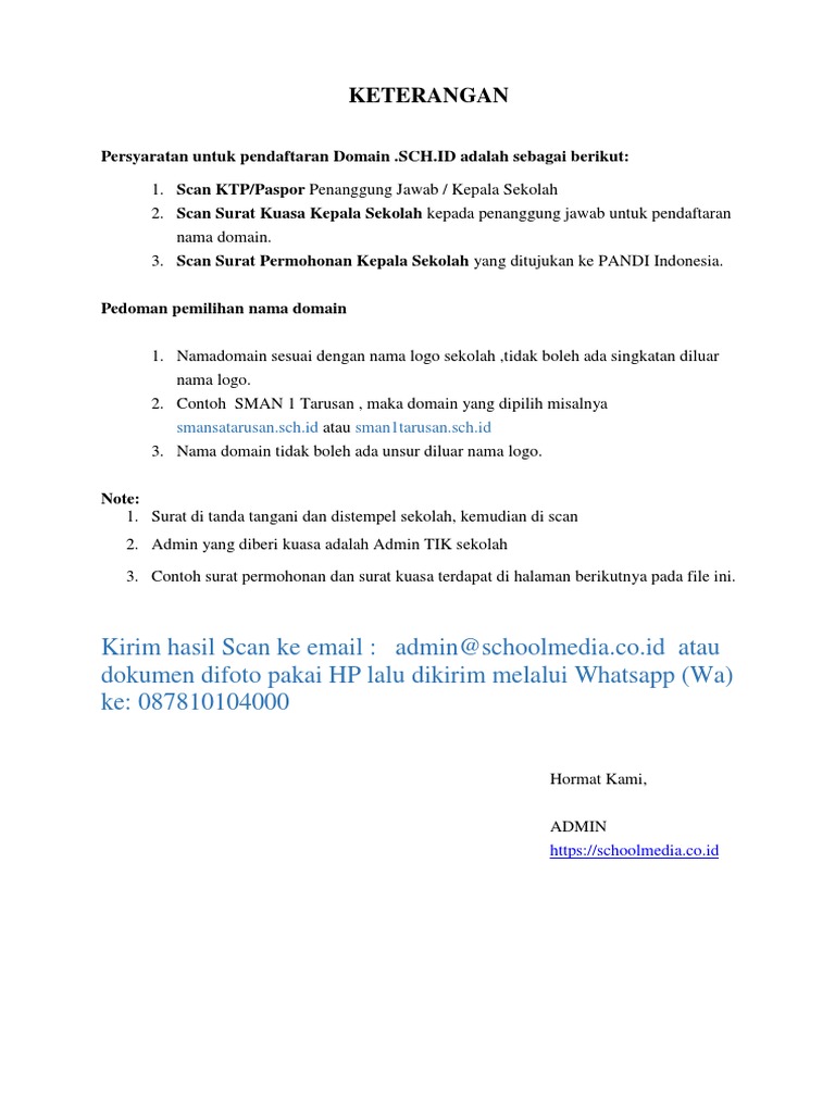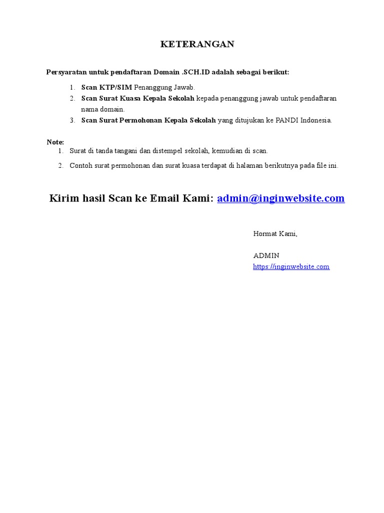 Harus dilengkapi dengan surat permohonan pendaftaran domain dari organisasilembaga terkait. Akta Notaris atau Surat Keterangan dari organisasi yang bersangkutan. Download Template Surat Keterangan Kepala Sekolah untuk Domain schidorid.