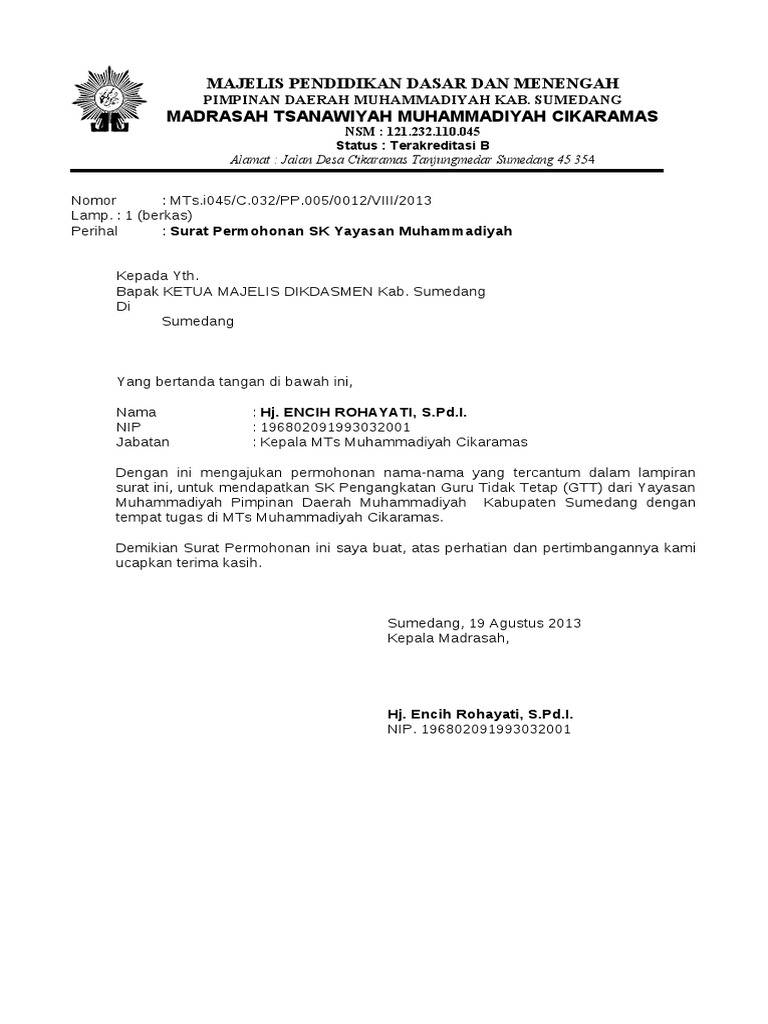 Contoh surat permohonan sk ikatan remaja masjid nurul yaqien tassilli ikranul dusun tassilli desa pattallassang kab. Berikut ini contoh SK pendirian yayasan dari lembaga PAUD. FC Kartu Tanda Anggota Muhammadiyah 5.