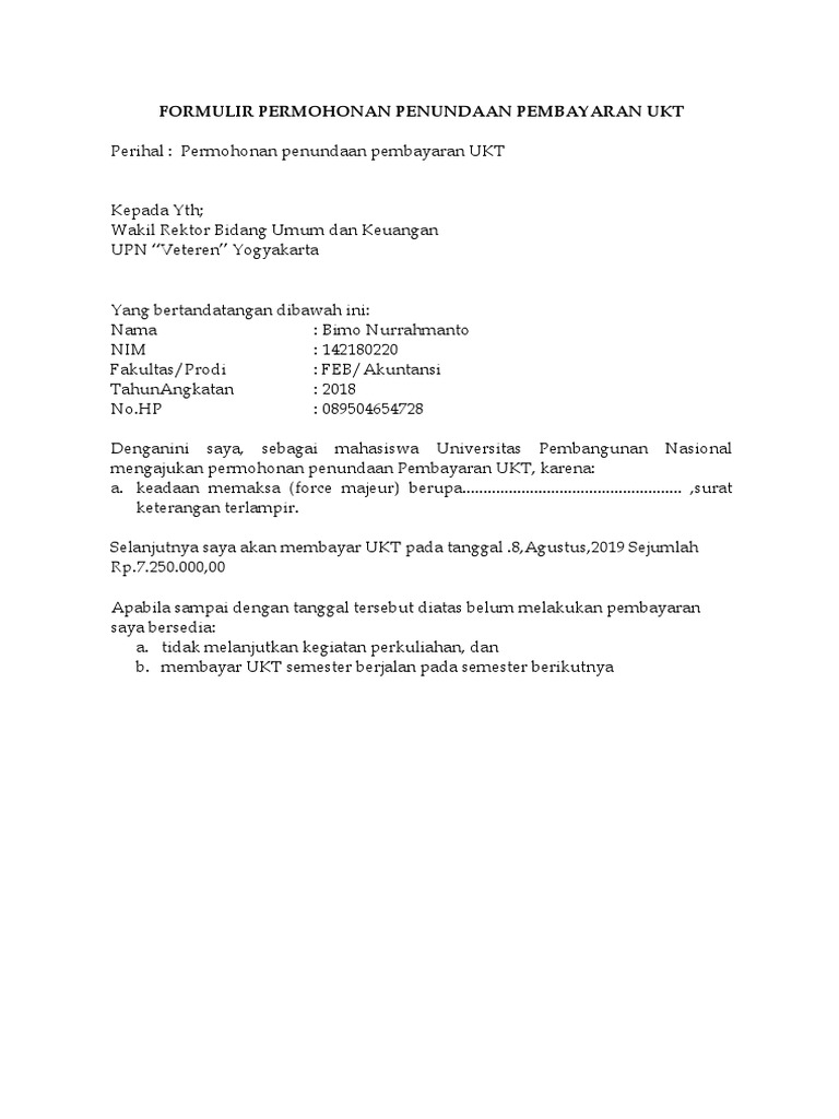 Permohonan penundaan pembayaran ukt jakarta 26 mei 2014 secara penuh kepada yth. S2 program studi. Sesuai dengan Peraturan Rektor Nomor 17 Tahun 2019 Pasal 3 Ayat 3 disebutkan bahwa Penundaan pembayaran UKT dilakukan dengan menunda dengan cara membayar 1 satu kali atau menunda pembayaran UKT dengan cara.