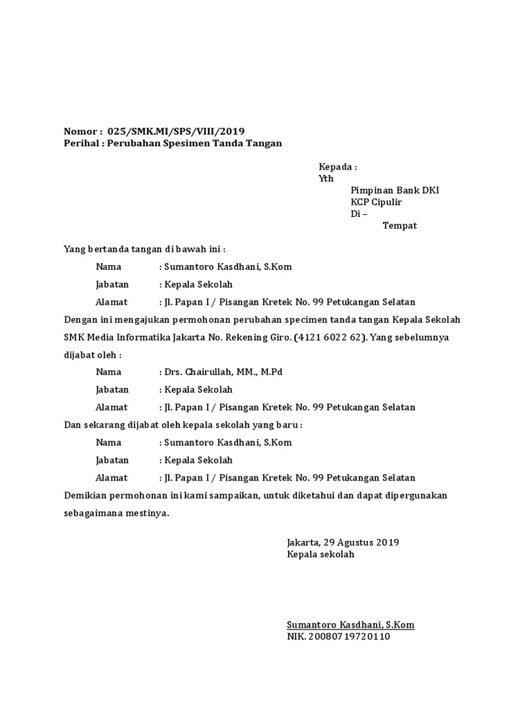 Surat permohonan pergantian kepala sekolah untuk bank doc. Semoga Berikut ini Anda bisa lansung Copypaste Permohonan Pergantian Specimen Sekolah. Kepala SMPN 3 Rambang Dangku Kepala Sekolah yang Baru Demikian surat keterangan ini dibuat untuk dapat dipergunakan sebagai syarat pengajuan specimen pergantian tanda tangan atas perhatian dan kerjasama yang baik diucapkan terima kasih. Untuk mengganti specimen atau tanda tangan tersebut perlu adanya surat pergantian specimen bank bni dari sekolah atau gampong yang bersangkutan.