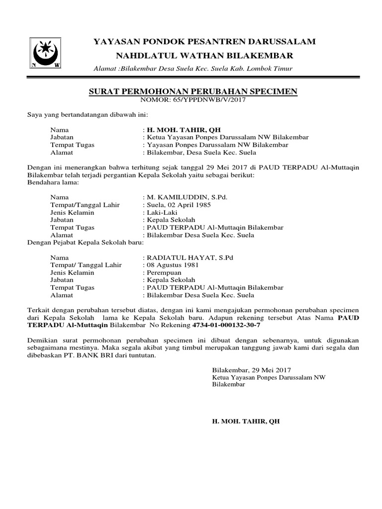 The collection that comprising chosen picture and. Pembuatan rekening baru ini biasanya terjadi pergantian kepala sekolah di suatu jenjang pendidikan tertentu. Contoh Surat Permohonan Pergantian Spesimen Bank Aceh Di 2020 Surat.